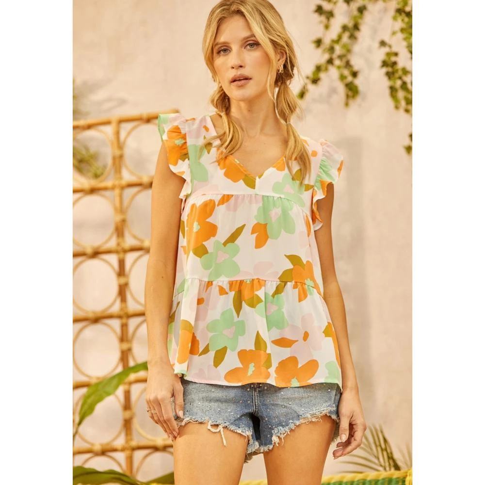 Tiered babydoll top with print all over this top! Flutter sleeves, v neckline, empire line with flowy fit. Non sheer, woven.