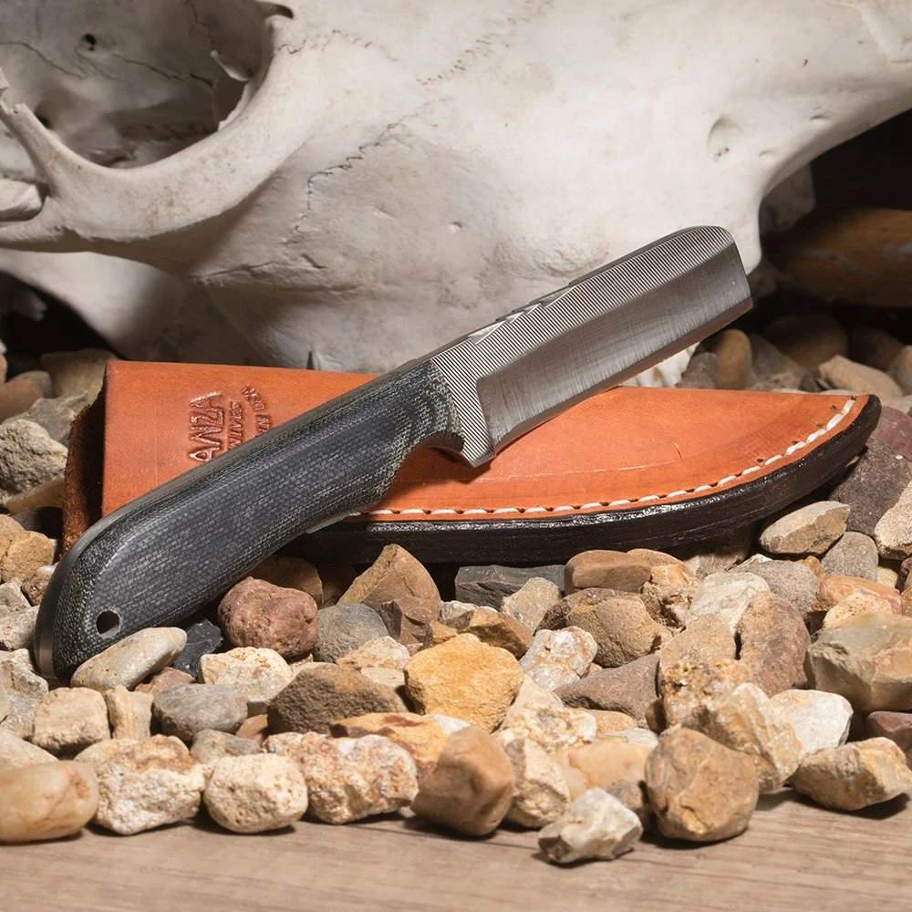 This Anza castrating knife is handmade with a micarta handle. Comes with a leather sheath.