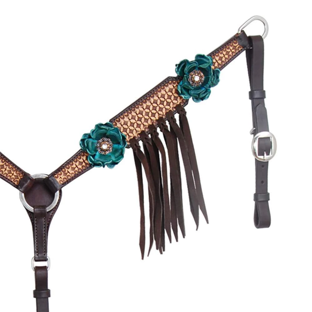 The beautiful Vintage Turquoise Flower collection from Circle Y is made exclusively for NRS. This breast collar is designed with two-tone stamping and fringe accents on the front. Finished with turquoise leather flowers and rhinestone conchos.