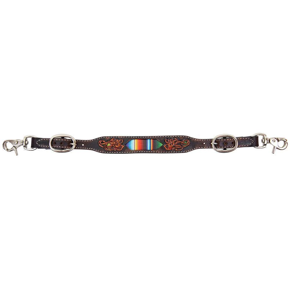 Beautiful, bright serape pattern on our microfabric peaks through the center cutout and floral filigree on this wither strap.