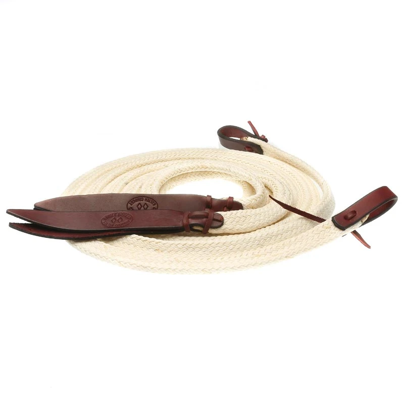 Made from lightly waxed rolled braid nylon rope. They are weighted for proper balance and the length works great for snaffle bits. They connect to the bit with 3/4″ wide 10/11 oz. burgandy harness leather water straps and have doubled tear drop shaped 6/7 oz. leather popper on the other end of the rein for weight.