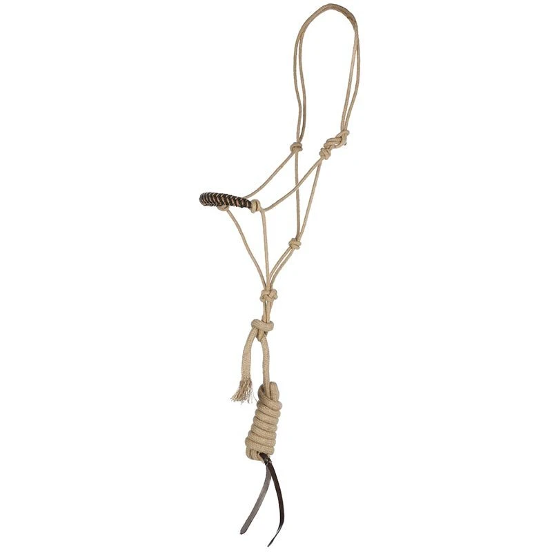 This is a jute rope halter that features braided black lace in the nose. The lead rope is 9′ long and is detachable. Jute is an all natural and extremely durable fiber.